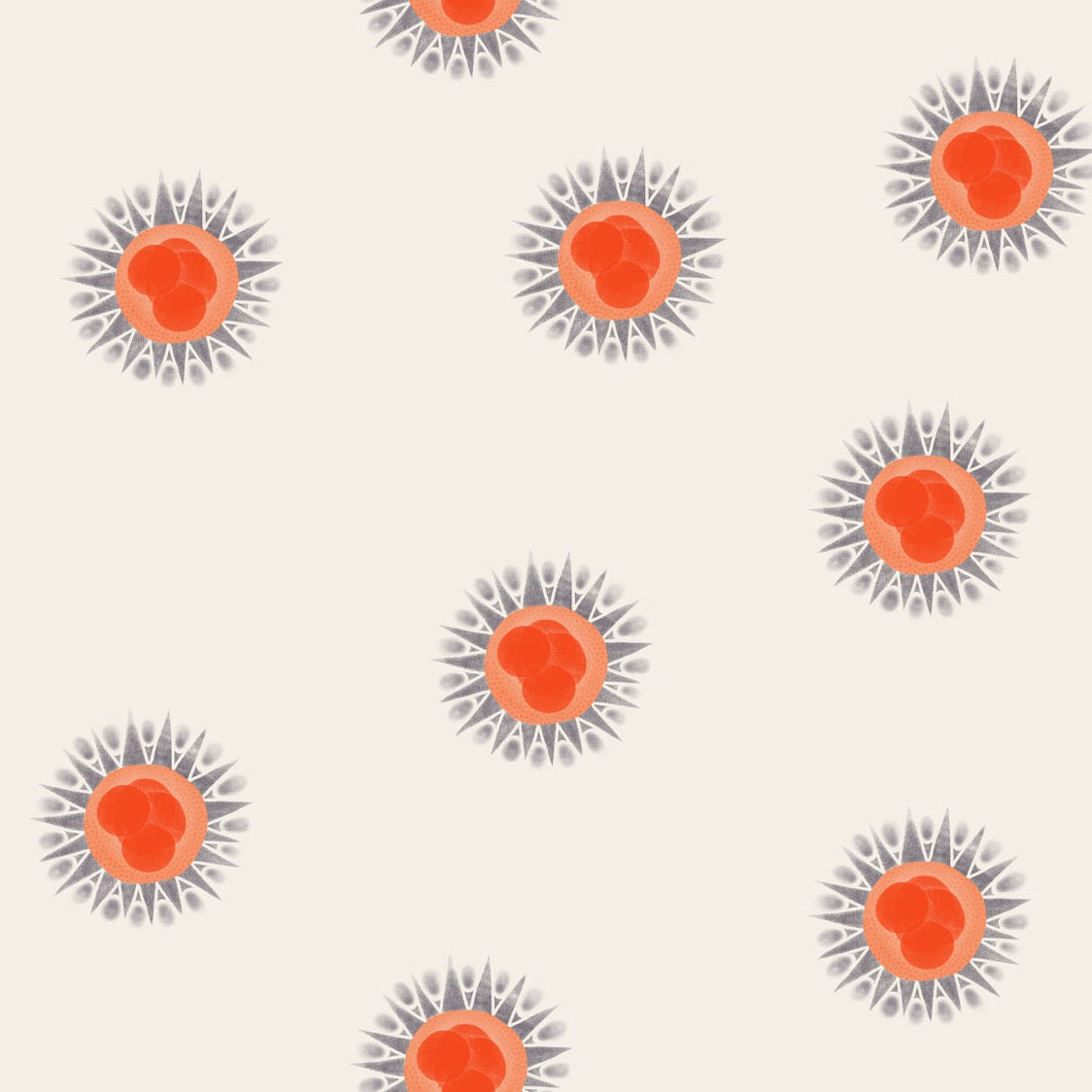 Mole es un papel mural de patrón repetido con formas circulares orgánicas que recuerdan pequeñas flores o soles abstractos. Su diseño combina un centro cálido en tonos terracota con delicados trazos grises, creando un contraste suave y equilibrado sobre un fondo claro.