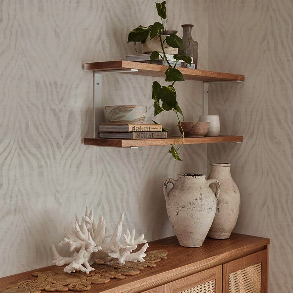 Este papel pintado muestra una gran versatilidad. Un efecto increíble y maravilloso entre Rayas y texturas. Finas pieles de cebras encarnadas en una ilustración delicada y elegante. Crean una decoración para pared misteriosa, sutil y al mismo tiempo animada. Otorgando textura, neutralidad y calidez a los muros.