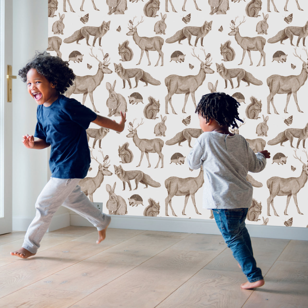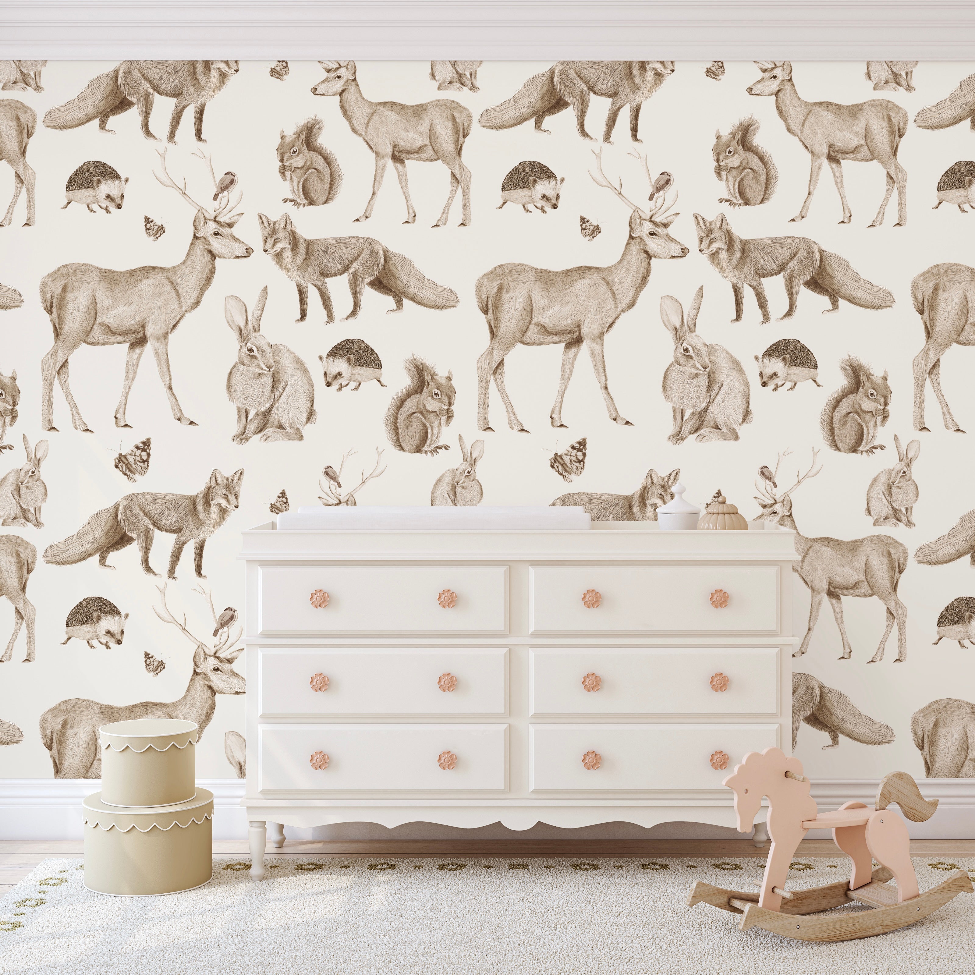 De nuestra colección el bosque y sus animales. Un papel que mezcla la fantasía del bosque con sus animales y la realidad. Papel mural 100% ilustrado a mano en colaboración con la artista nacional Francisca Méndez.